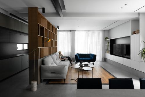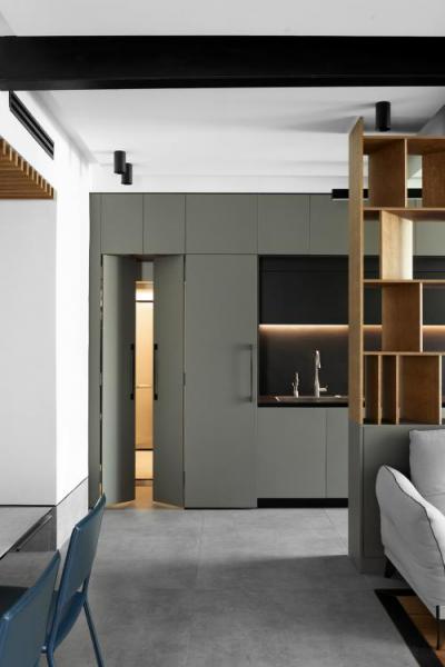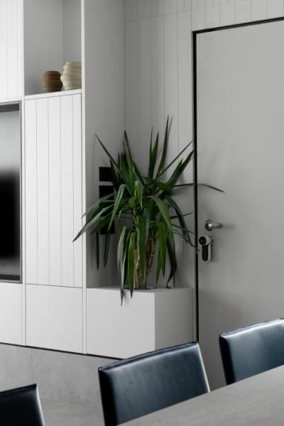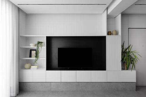 הטלוויזיה מוקמה במלבן מושחר במרכז, המטשטש את גבולותיה ויוצר עומק. ליד הדלת שולבה אדנית לתוספת ירוקה ומרעננת, ולצד פינת האוכל תוכננו ספסל ישיבה וארון אלכוהול. התוצאה היא קומפוזיציה נקייה ומוקפדת, המחברת בין הפונקציות השונות בחלל.