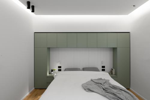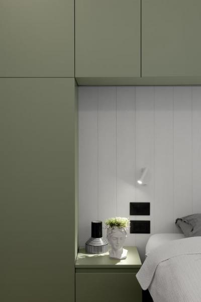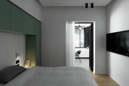 מכאן שנדרש מהמעצב ניצול אופטימלי של השטח ותכנון פתרונות אחסון חכמים. בחדר השינה הזוגי הוא תכנן יחידת נגרות החובקת את המיטה – משני הצדדים תוכננו ארונות קטנים לחפצים אישיים, ולצידם שידות קטנות. מעל המיטה מאוחסנים ספרי קריאה, ושולבה תאורה נסתרת ליצירת אווירה רכה ועוטפת. מחדר השינה ניתן לגשת למשרד ביתי, בו תוכנן ארון בגדים גדול. מהמשרד ניתן גם לצאת החוצה לגינה, וכך ניתן לקיים פגישות מבלי להפריע להתנהלות השגרתית של בני הבית.