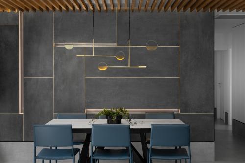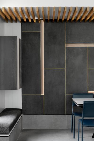 בקיר האחורי, שמספק רקע לפינת האוכל, ניתן לראות גריד נוסף שהודגש באמצעות סרגלי פליז ותאורה נסתרת – "השתמשנו באריחים דקיקים בעובי 3 מ"מ שהונחו בחלוקה מונדריאנית. בקיר הגבס שולבו נישות לתאורה, והקפדנו לתכנן אותן כך שלא ייווצר סנוור," אומר איתן, ומסביר כי כיוון האור נקבע בהתאם לכיווני המבט – בעמידה או בישיבה – כדי ליצור תחושה נעימה ולמנוע סנוור.