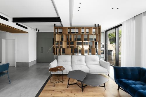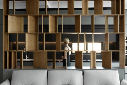 המעצב דאג אפילו לפתרון נוח להוצאת מנות והעברת כלים משני המטבחים הפנימיים לפינת האוכל החיצונית דרך החלונות. מחיצת עץ, המורכבת מגריד מרובעים, מפרידה בין הסלון לבין המטבח ומייצרת פרטיות והסתרה חלקית. היא הותאמה לרוחב הספה, וחלק מהצלעות שלה תוכננו באלכסון ליצירת עומק ועניין.