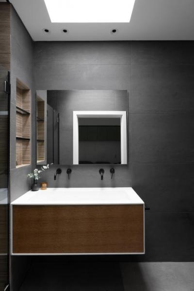 בחדרי הרחצה שולבו אלמנטים מרובעים הממשיכים את השפה העיצובית של הבית, וכן פרטים המדגישים את פרופורציות החלל. בחדר הרחצה הזוגי, למשל, שולבה תאורה נסתרת מרצפה ועד תקרה בגב האסלה, וכך נוצרת תחושה של מרחב וגובה. סקיילייט מרובע מכניס אור טבעי לחדר ומגדיר מלמעלה את יחידת הכיור.