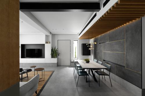 סרגלי פליז, מסגרות לריצוף, תאורה נסתרת וקונטרסט בין חומרים מדגישים את המוטיבים העיצוביים ואת החלוקה לגריד שתוכננה באזורים שונים בבית. נבחרו אריחים גדולים כדי ליצור תחושה של גודל, ופאנל גבוה שקוע בקיר עם פרט ניתוק שחור עונה על צרכים פונקציונליים ויוצר אפקט של גובה בחלל הציבורי.