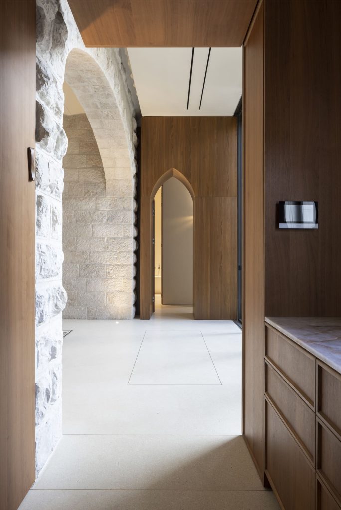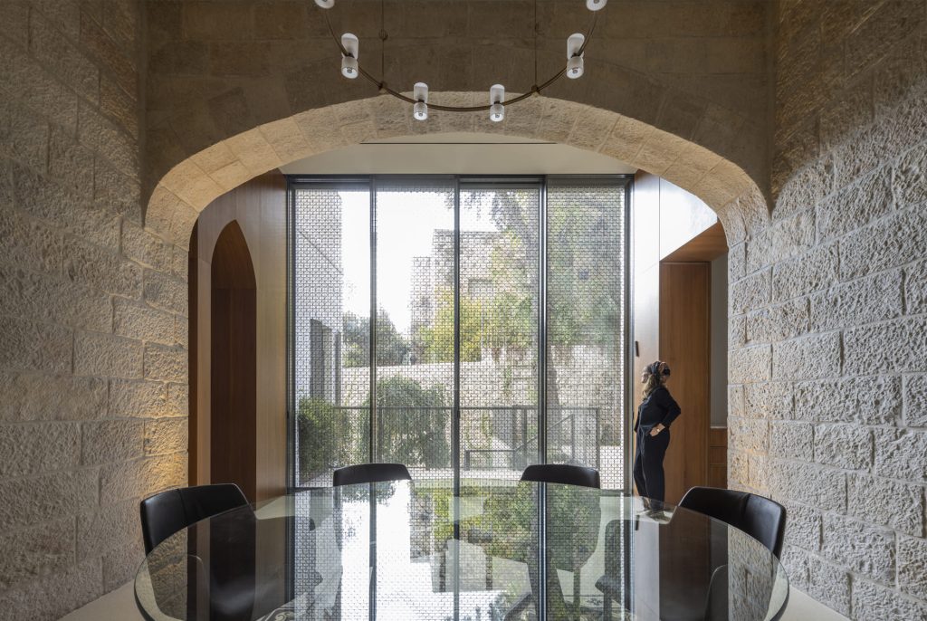 כאשר משפצים מבנה קיים, ובוודאי כאשר מדובר במבנה לשימור, השאלה המרכזית היא כיצד תשתלב הבנייה החדשה במה שכבר קיים. במקרה הזה, במקום לטשטש את החיבור בין הישן לחדש וליצור מראה הומוגני, הוחלט דווקא להדגיש את המפגשים באמצעות חיפויי עץ ונגרות, הממשיכים את הבנייה ההיסטורית באבן. "לא ניסינו לחקות את השכבה הקיימת ולהיטמע בתוכה. השכבה החדשה נבנתה בטכנולוגיות ובחומרים עכשוויים, והיא מחזקת את הנוכחות של השכבה ההיסטורית. כל אחת נוצרה בתקופה אחרת, והצופה, שאינו יודע מה נבנה מתי, רואה את השכבות החשופות. השוני ביניהן יוצר אסתטיקה חדשה."