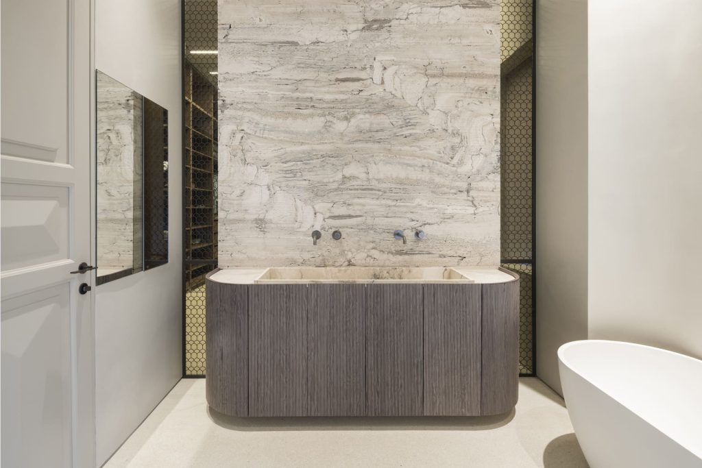 השכבה החדשה עוצבה ברובה באמצעות נגרות, ונקודת המפגש בינה לבין פרטי האבן והברזל ההיסטוריים מספרת את סיפורו של הבית דרך חומר, טקסטורה ומרקם. הנגרות מכילה גם מערכות כמו מיזוג אוויר כתחליף להנמכות תקרה: "רצינו להשאיר את התקרה חשופה ולהראות את תצורת הבנייה. במקום הנמכות תקרה הכנסנו את המערכות לאלמנטים חדשים של נגרות שמראים היכן נמצאים המרכיבים החדשים בבית לעומת אלו ההיסטוריים". מאחורי פינת האוכל, שממוסגרת על ידי קשתות אבן ופונה לחלון גדול לכיוון הגינה, תוכננה משרבייה חדשה. היא עוצבה בהשראת עבודות המתכת ההיסטוריות של הבניין ומסייעת בסינון קרינת השמש החזקה בחזית הדרומית