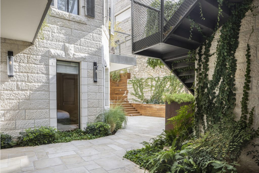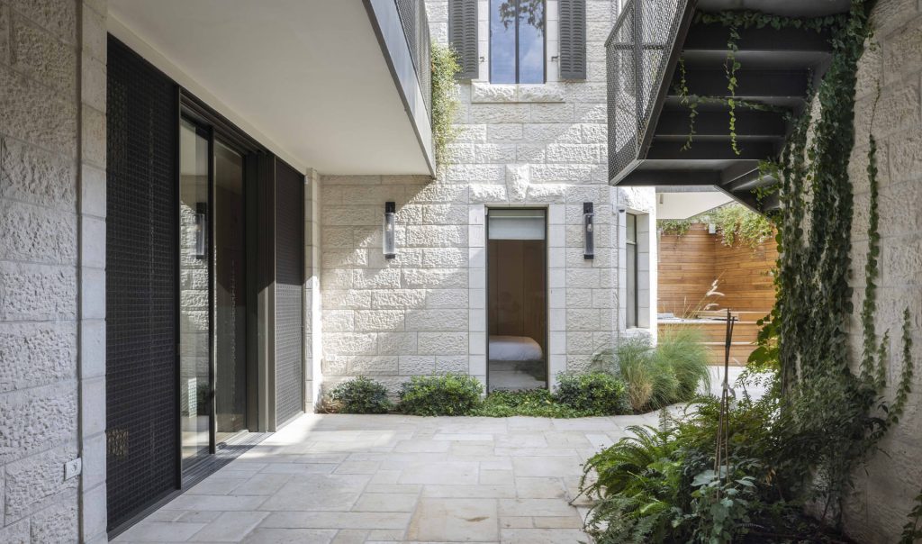 המעבר מהרחוב אל תוך הבית מלווה בצמחייה ואלמנט מים, במטרה ליצור מעבר הדרגתי מהחוץ הרועש אל הפנים השקט והרגוע. הכניסה נעשית דרך גרם מדרגות היסטורי, המוביל למבואה שמזמינה פנימה אל החלל המרכזי. ציר אורכי נמתח מהכניסה ועד הגינה האחורית דרך פינת האוכל, ומחלק את הבית לאגף פרטי ואגף ציבורי – משמאל חדרי השינה וחדרי הרחצה של ההורים והילדים ומימין הסלון והמטבח. במרכז, גרם מדרגות המוביל לקומה התחתונה, שם תוכננו אזור אירוח, חדר משפחה, בריכת שחייה ושטחי חוץ