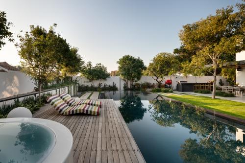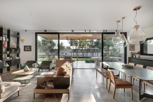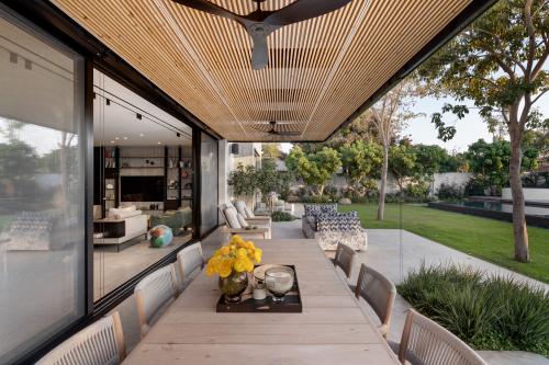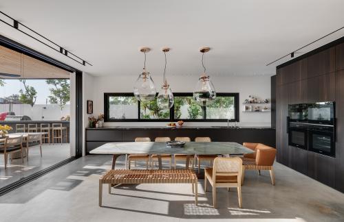 השולחן תוכנן אפילו בגובה מעט נמוך מהסטנדרט ליצירת תחושה נעימה וסלונית יותר ומעליו נתלו גופי תאורה מרשימים שמדגישים את נוכחותו. במטבח תוכננו שפע מקומות אחסון לצד שני כיורים, שני מדיחי כלים ומזווה נפרד אליו נכנסים דרך המטבח. בסלון הספות הופנו זו לזו כדי לעודד שיח ובחוץ תוכננו מגוון אזורי ישיבה שונים, מטבח חוץ וג'קוזי לצד הבריכה.