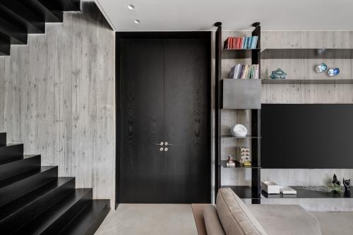 הדלת שתוכננה בהתאמה אישית ובוצעה על ידי נגר משלבת עץ מחורץ וזכוכית וכך מבטיחה את פרטיות הדיירים וכן מכניסה אור טבעי פנימה.