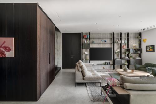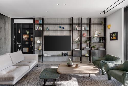 ביניהם מדפי ברזל דקיקים, החושפים ומדגישים את קיר הבטון,  וכן מספר יחידות אחסון סגורות לכלי אירוח. עבור המטבח נבחר משטח עבודה מאבן טבעית ואת חזיתות הארונות הגבוהים מחפה פורניר, שעשוי ממספר לבדים שונים ליצירת טקסטורה עשירה וגוונים משתנים. גם בחדרי הרחצה נבחרו חומרים טבעיים כאשר בכל חדר רחצה החומריות מעט שונה. בחדר הרחצה הזוגי למשל, שולב משטח כיור מאבן לצד חיפוי פסיפס בעבודת יד וקיר בטון חשוף, עבורו נדרשו פרטים מיוחדים לשילוב הברזים והכלים הסניטריים.