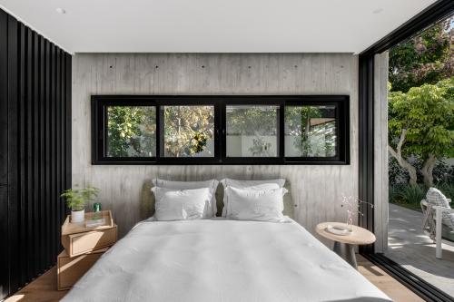 כאמור, היא מוקמה בקומת הקרקע מאחורי הסלון. שתי דלתות כפולות ומרשימות, שמתחברות נהדר לטקסטורה של קיר הבטון, נפתחות מול מבואה וספרייה, שממלאת תפקיד כפול – היא מחלקת את יחידת ההורים לחדר ארונות משמאל ולאזור השינה מימין, ומאחוריה נמצא חדר הרחצה הזוגי. בנוסף היא מתחברת ויזואלית ליחידת המדפים שבסלון – "כשהדלתות פתוחות מכיוון חלל המגורים יש אשליה שזה המשך של הספריה בסלון והיחידה הופכת להיות חלק בלתי נפרד מהעושר הויזואלי שבחלל הציבורי" מסביר דודו. פרקט מוסיף חמימות לחדר וויטרינה רחבה עוטפת את החלל בגווני ירוק מהגינה המטופחת.