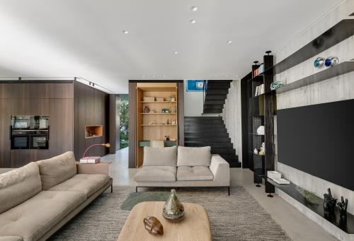 הפרט הזה הוא דוגמה לחשיבה יצירתית שמאפשרת לבית להמשיך להיות נוח ורלוונטי גם בהמשך הדרך. דוגמאות נוספות ניתן לראות בכל רחבי הבית ובולטות בעיקר יחידות הנגרות האלגנטיות, כמו פינת העבודה שמוקמה בסלון וניתן להסתירה בעת אירוח באמצעות דלתות כיס.