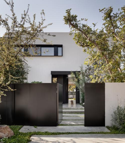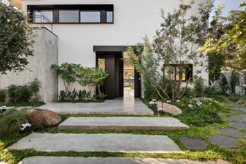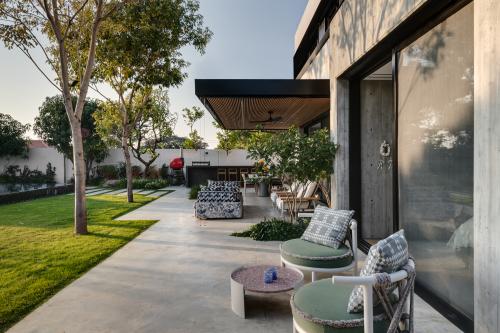 ואכן הנוכחות של הגינה מהותית לבית כבר מהכניסה, בה מדרכי בטון שולבו עם צמחייה ועצים ים תיכוניים כמו חרוב, אלון ורימון. הגינה האחורית מתבססת על עצים טרופיים כמו ליצ'י ומקדמיה ובעומק המגרש תוכננה הבריכה שמחופה באבן טבעית, היוצרת גוון ירקרק ומרענן. הבריכה מעט מוגבהת ממפלס הקרקע כאשר ההשראה היתה מעיין טבעי הצומח מתוך האדמה. מהכניסה לבית ועד פינות הישיבה המפוזרות בגינה, הכל תוכנן כך שהמשפחה תוכל ליהנות מהמרחב הפתוח לאורך שנים, גם כשהצרכים משתנים. הגינה מספקת להם מקום לאירוח, למשחק, ולשהייה יומיומית שמתאימה לאורח החיים שלהם כיום ובעתיד.