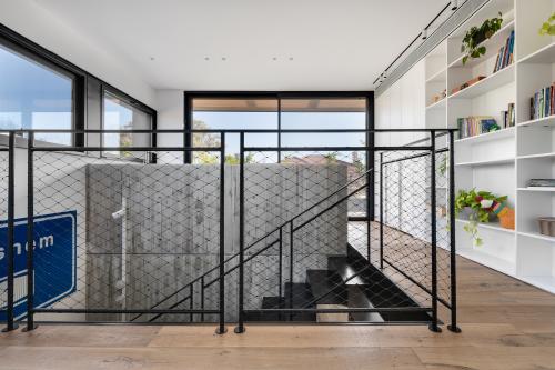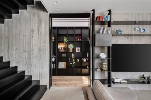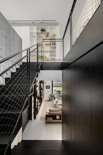 ברחבי הבית שולבו מגוון חומרים טבעיים בטקסטורות מגוונות ליצירת חללים עם נוכחות ואווירה נעימה. השימוש בעץ, בטון, ברזל, זכוכית ואבן מבטיח אסתטיקה שמתיישנת בחינניות ובכבוד ועומדת במבחן הזמן. תראו, למשל, את מדרגות הברזל המושחרות, הניצבות לצד הסלון ונשענות על קיר בטון חשוף המשמש רקע לקיר הטלוויזיה, שעליו ספריה מרשימה.