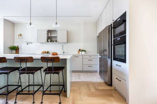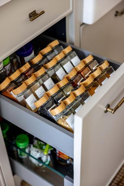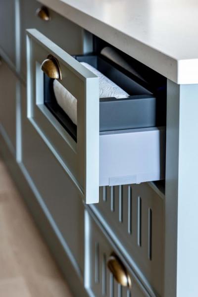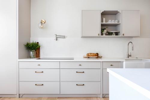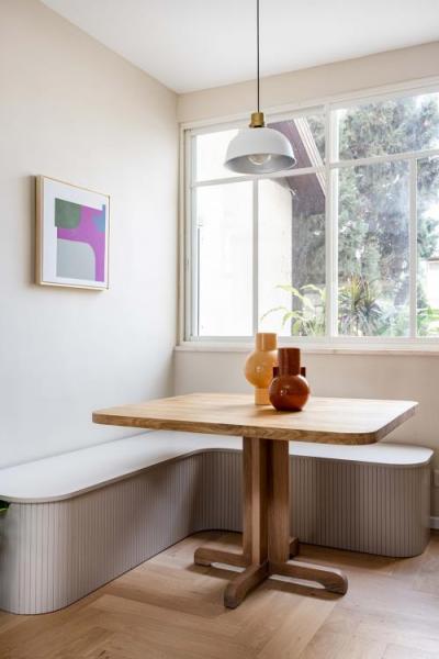 השינויים המבניים אפשרו את הגדלת והרחבת המטבח, שזכה למהפך מרשים. הוא כולל צלע של ארונות גבוהים מצד ימין, משטח עבודה במרכז ויחידה גבוהה נוספת בקצה השמאלי המשמשת כארון שירות ומזווה. עבור הארונות נבחר גוון אפרפר חמים וחזיתות האי המרכזי נצבעו בגוון מרווה. המטבח בוצע על ידי נגר וכולל כמה פרטים המשדרגים את העבודה במטבח ובחלקם מגיעים מהמטבחים האמריקאיים. תראו למשל את מגירת התבלינים הרחבה ואת היחידה שהותאמה במיוחד לנייר הניגוב, שלרוב עומד על משטח העבודה. אל תפספסו גם את הברז שתוכנן מעל הכיריים ומשמש למילוי סירים ומכונה גם "ברז פסטה". לצד המטבח תוכננה פינת אוכל קטנה ונעימה עם ספסל ישיבה מתעגל בהשראת הדיינר האמריקאי.