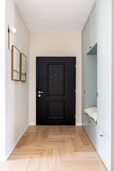 "אני אוהבת לשלב צבע באזורי מעבר כמו הכניסה והמסדרון. כך הצבע מרומז ולא משתלט על המרחב. זאת לעומת אזורים ששוהים בהם או מסתכלים עליהם לאורך זמן כמו פינת האוכל או קיר הטלוויזיה" אומרת המעצבת. בהתאם, היא תכננה יחידת נגרות בכניסה בגוון ירקרק מרענן, שכוללת ספסל ישיבה ואחסון רב בהשראת 'חדרי הבוץ' שבארצות הברית ואירופה. כדי לפתוח את החלל, שלפני השיפוץ היה חשוך ומחופה כולו בעץ, הרחיבה בטי את המסדרון וכך נוצר מקום לנגרות הנדרשת. דלת הכניסה הוחלפה גם היא ונבחרה בגוון כהה שמספק קונטרסט לגוון הירוק הבהיר ולפרקט החמים.
