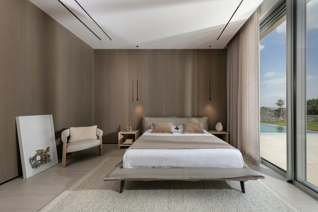 השפה העיצובית נקייה ומודרנית ומשלבת פונקציונליות עם אלגנטיות וחיבור לטבע. קירות זכוכית גדולים וחללים פתוחים יוצרים זרימה והמשכיות בין הפנים לחוץ, כשהבריכה משמשת מוקד מרכזי ונשקפת מחללי המגורים.