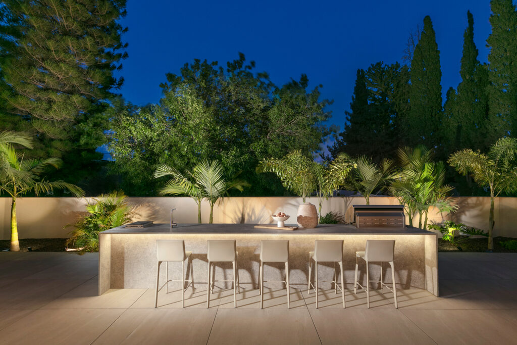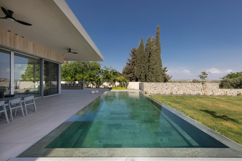 פלטת גוונים חמימה, המתבססת על גווני בז', חום ולבן שבור, עם שימוש נרחב בעץ ובאבן ממשיכים גם החוצה בריצוף, חיפויי הקירות, חזיתות המטבח החיצוני ואלמנטים משלימים נוספים. הבריכה, בשטח של כ-50 מ"ר, חופתה באבן ירקרקה בגדלים משתנים, המעניקה למים גוון טורקיז המשתלב בהרמוניה עם עיצוב הבית והנוף המרהיב.