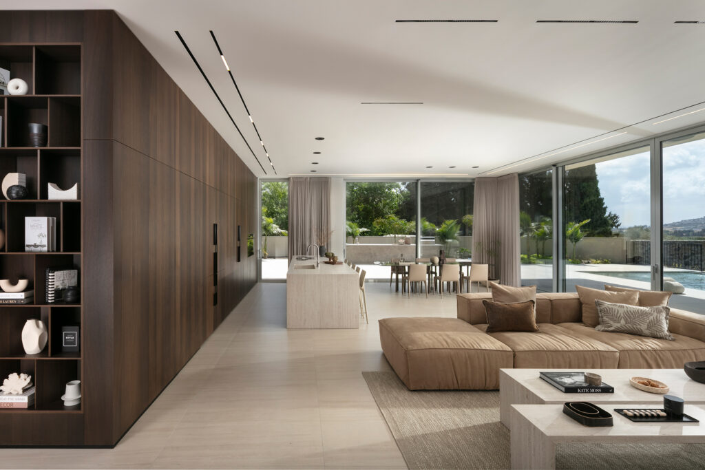 השפה העיצובית נקייה ומודרנית ומשלבת פונקציונליות עם אלגנטיות וחיבור לטבע. קירות זכוכית גדולים וחללים פתוחים יוצרים זרימה והמשכיות בין הפנים לחוץ, כשהבריכה משמשת מוקד מרכזי ונשקפת מחללי המגורים.