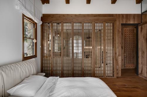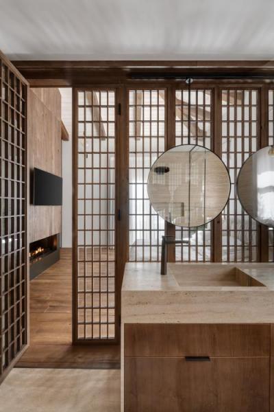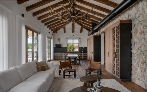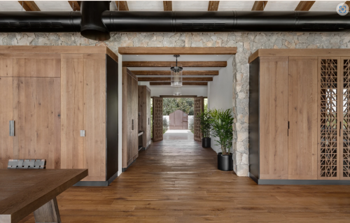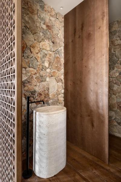 שתי דלתות כניסה רחבות נפתחות למסדרון רחב, המוביל לחלל הציבורי ופונה לויטרינות החושפות את החצר והנוף. קיר אבנים טבעיות, המחפה את חלק מקירות הבית החיצוניים, נכנס פנימה ומלווה את הסלון, פינת האוכל והמטבח. במטבח שולבו מגירות עם חזיתות מתכת וארונות גבוהים עם קורות עץ ישנות ופרזול בעבודת יד. לצידו צמד ארונות יין שפונים לכיוון הסלון וכוללים חזיתות משרבייה מעץ. המשרבייה מופיעה כמוטיב חוזר בפרויקט ומשמשת לחשיפה ולהסתרה חלקית של חללים ואלמנטים ברחבי הבית. תראו למשל את המחיצה המצניעה את הכניסה לשירותי האורחים, ואת חדר השינה המרהיב, שהופרד מחדר הרחצה הצמוד על ידי משרבייה גיאומטרית.