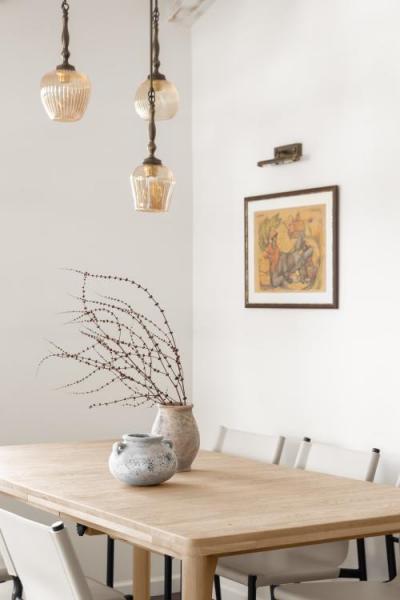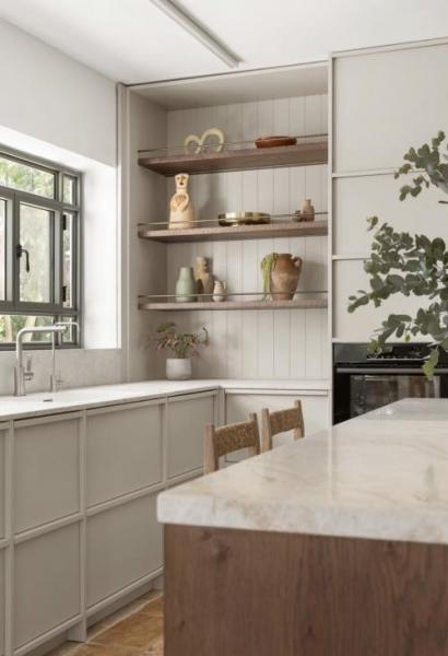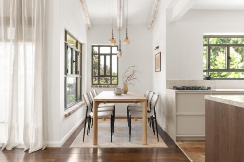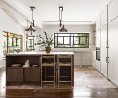 כדי להצליח לחבר בין האלמנטים הקיימים לבין העיצוב החדש, צריך למצוא את האיזון בין הסגנונות. כך נוצר הסגנון המיוחד של הדירה הזו, שהיא קצת מודרנית וסקנדינבית וקצת כפרית עם טעם של פעם. תסתכלו למשל על עיצוב המטבח. כדי לענות על הקונספט 'בין ישן לחדש' שולבו בו מסגרות עבות, המתקבלות על ידי ניתוק בין היחידות. החלק העליון נראה כמו חלק מהמסגרת, אך הוא למעשה משמש כידית. בארונות הגבוהים שולבה פתיחה בלחיצה והמקרר האינטגרלי מאפשר יצירת המשכיות וחזית אחידה ואסתטית לכיוון החלל הציבורי.