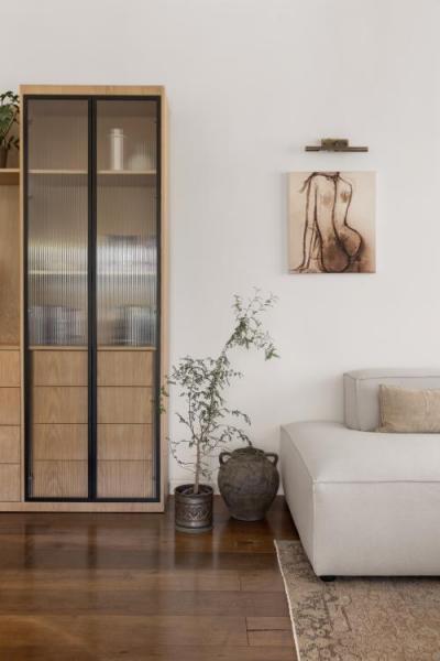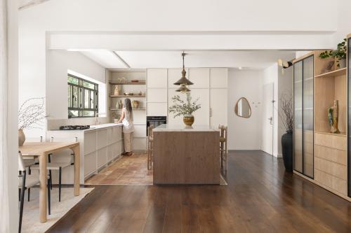 בדירה הזו בהרצליה, בה מתגוררים זוג הורים ושתי בנותיהם הבוגרות, הבינה מעצבת פנים אופיר אסולין את הפוטנציאל והערך הגלומים במה שקיים – "כבר בפגישה הראשונה הבנתי שיש הרבה מה לשמר בבית. זו משפחה עם נגיעה אמנותית, שאוהבת לטייל בעולם ולאסוף פריטים מיוחדים. מכאן כמעט אוטומטית קבענו את הקונספט 'בין ישן לחדש'." בהתאם היא השאירה אלמנטים מיוחדים כמו הקורות בתקרה והריצוף במטבח, יצרה מקום ראוי לאוספים של בני המשפחה ובחרה אלמנטים שמתחברים לאופי המשפחה ולפריטים קיימים ובמקביל יוצרים שפה עיצובית עדכנית וחדשה.