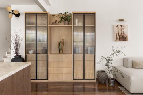 "למרות שבני המשפחה חובבי אמנות והיו להם הרבה חפצים דקורטיביים וספרים, לא היה מקום להציג או לאחסן אותם בצורה אסתטית ומסודרת" מספרת המעצבת. לכן היא עיצבה ספרייה שבוצעה על ידי נגר, המביאה את האופי והאוספים של בני הבית לידי ביטוי בחלל הציבורי ויחד עם זאת שומרת על מראה נעים, מסודר ומאורגן. היא שילבה עץ אלון מולבן עם זכוכית מסוג גלינה, ותכננה מדפים פתוחים וגם אחסון סגור כדי לייצר איזון בין מה שגלוי לבין מה שמוסתר. במרכז הספרייה השאירה מדף גדול שבו מניחה ומחליפה בעלת הבית תמונות שהיא עצמה יוצרת.