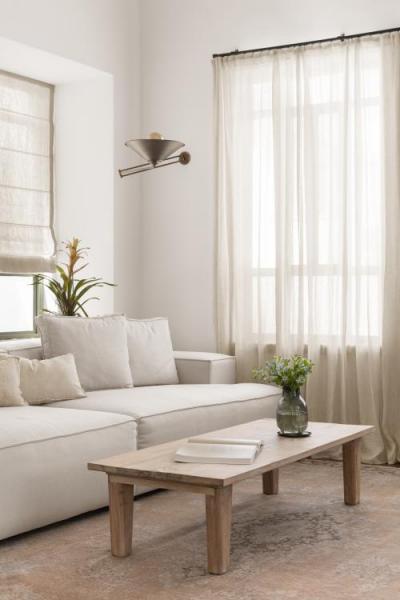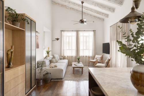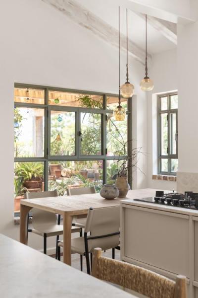 לעומת הריצוף, שהיה מושלם כפי שהוא, אלמנטים אחרים בבית דרשו עדכון כדי להתאים לסגנון המעודכן ולפלטת הצבעים שגיבשה המעצבת. תראו למשל את הקורות בסלון, שהיו קיימות לפני כן אך גוון העץ שלהן לא התאים לפרקט שנבחר. לכן הוחלט לצבוע אותן בהתזה וכך לשמור במקצת על הגוון המקורי בשילוב צבע בהיר ומרענן. התוצאה היא מראה מעט מחוספס, לא מוקפד או מלוקק מדי, שמשתלב נהדר עם הגוונים החמים של הסלון.