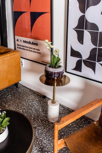 בהתאם לסגנון הנוסטלגי והתעשייתי שהוגדר, שולבו פרופילים בלגיים מושחרים לחלונות, ריצוף טרצו וחומרים טבעיים כמו ברזל, עץ, עור וקש.