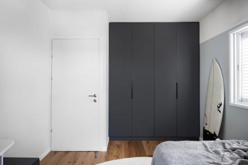 דלת מדגם טל בצבע לבן של חברת רב בריח נבחרה לכניסה לדירה ודלתות מסדרת Top Mix Color נבחרו לחללי הפנים, גם הן בצבע לבן.