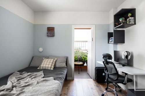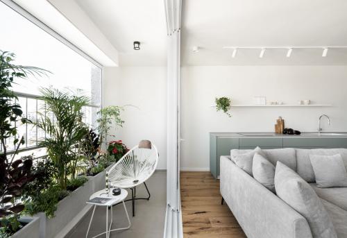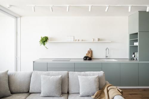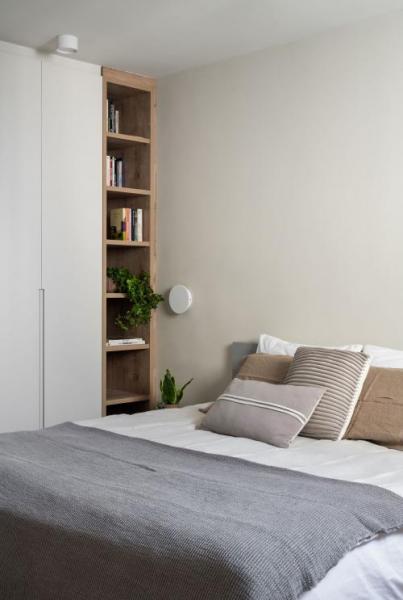 למטבח הפתוח נבחר גוון ירקרק מרענן וצלע גבוהה נוספת, שממוקמת בין דלת הכניסה למסדרון, נצבעה בגוון בהיר. חלק ממנה הוקדש לטובת ארון כניסה וכולל אחסון מעילים, תיקים ונעליים. בחדר השינה של בעלת הבית בולט השימוש בגווני חול חמימים, המודגשים באמצעות ספרייה צרה וגבוהה בגוון עץ טבעי.