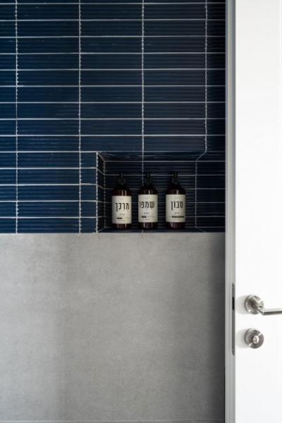 בחדרי הרחצה שולבו אריחים כחולים ורוקים בטקסטורה גלית עם גוונים ניטרליים של לבן ואפור, ולמרפסת נבחר אריח בגוון חול עם מרקם עדין.