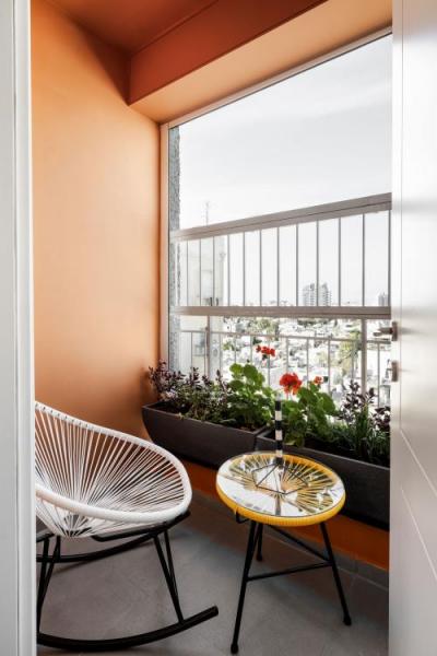 במרפסת הקטנה שצמודה לחדרי הבנים נצבעו הקירות בגוון כתום משגע, וחלק מקירות החדרים נצבעו בגווני תכלת נעימים.