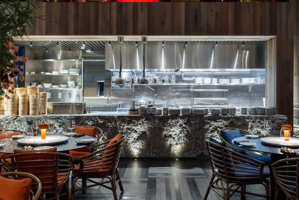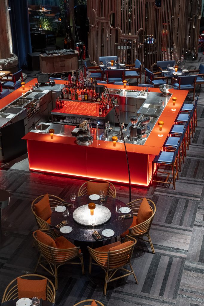 On the lower level, the open kitchen pulses at the heart of the action. More than a culinary workspace, it functions as a live performance, connecting chef and guest in real time. The transparency of process is echoed in the architecture itself — a motif of openness, flow, and transformation.