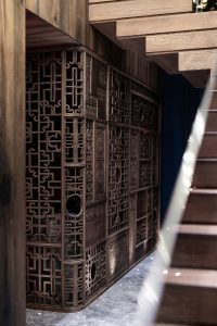Surrounding elements reveal the designers’ meticulous attention to material and meaning: hand-carved dragons wrap around granite-based columns, blurring the line between architecture and art. Natural textures — bamboo blinds, woven rattan screens — soften the boldness with warmth and intimacy, creating a tactile dialogue throughout the space.