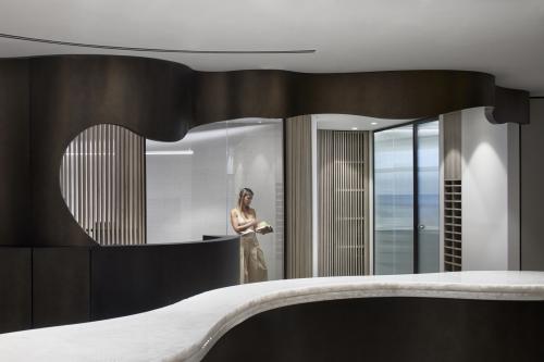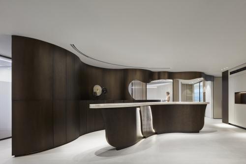 הדלפק והקיר שמאחוריו עוצבו בצורניות אמורפית, בעלת קשתות ועקומות משתנות המקנות להם נפח. הגוון הכהה שנבחר עבורם יוצר קונטרסט עם הרקע הבהיר, ומדגיש את התנועתיות והזרימה המעגליות הנוצרות סביבם, אשר באות לידי ביטוי בחלוקת החלל. אלו מאפשרות מבט פתוח אל הנוף המרהיב הנשקף מחללי המשרד.